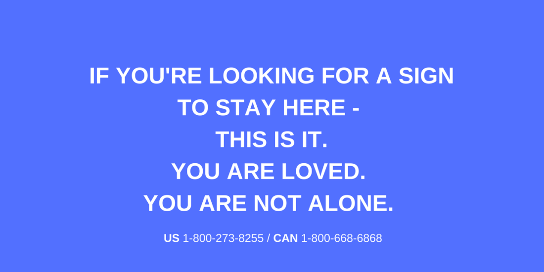 fandomjunkie2004 Uncategorized April 29, 2018December 4, 2018 1 Minute affirmationbanners: YOU ARE LOVED. 1-800-273-8255 Share this: Share on X (Opens in new window) X Share on Facebook (Opens in new window) Facebook Like Loading... Related Published by fandomjunkie2004 View all posts by fandomjunkie2004 Published April 29, 2018December 4, 2018