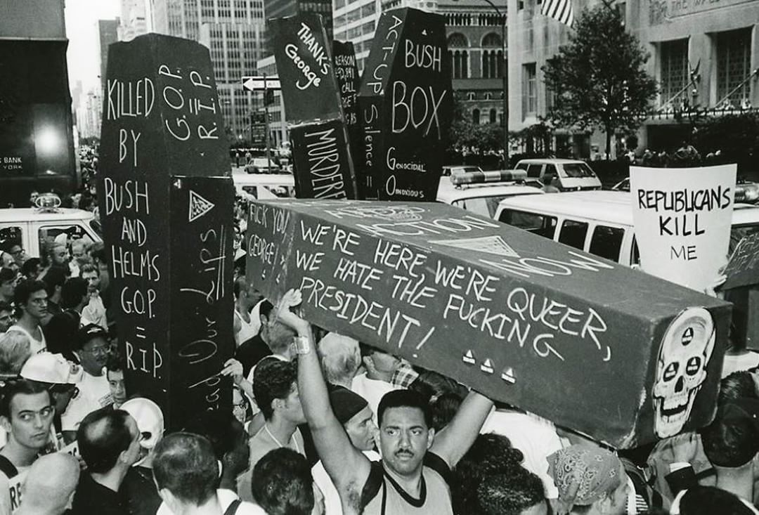 “WE’RE HERE, WE’RE QUEER, WE HATE THE FUCKING PRESIDENT!,” AIDS Coalition To Unleash Power (ACT UP), New York City, 1990.