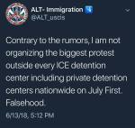 ALT-Immigration: Contrary to the rumors, I am not organizing the biggest protest outside every ICE detention center including private detention centers nationwide on July First. Falsehood.