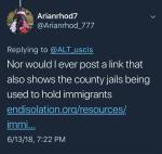 [In response to/attached link/pic of two people on their phones in front of the Twitter logo; caption reads, “Twitter sues federal government to keep anti-Trump user @ALT_uscis anonymous…”]Arianrhod: Nor would I ever post a link that also shows the county jails being used to hold immigrants https://www.freedomforimmigrants.org/detention-statistics/