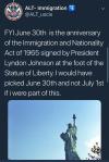 FYI June 30th is the anniversary of the Immigration and Nationality Act of 1965 signed by President Lyndon Johnson at the foot of the Statue of Liberty. I would have picked June 30th and not July 1st if i were part of this. [Pic of the Statue of Liberty attached.]