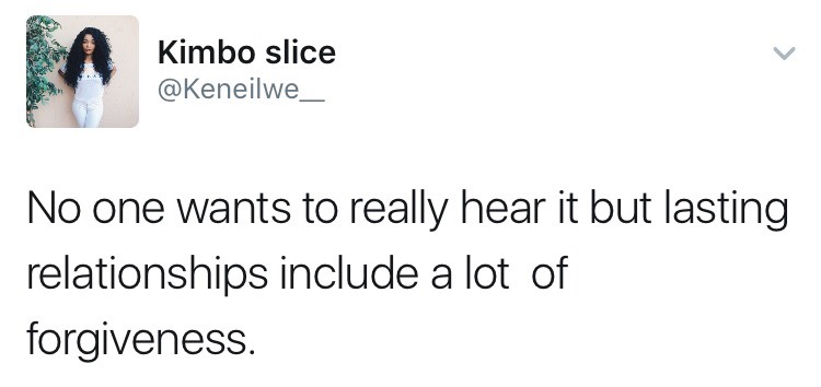 Forgiving the fact that they’re people who are working through their past, like you, and will occasionally project their past traumas on you the way you might with them. Forgiving yourself, because growth takes time, and learning to be a pair is more work than just being on your own. Having partners you trust to forgive those moments where you might fall, help you back up and move forward, in my opinion, builds up the trust and love you need for a thriving relationship.