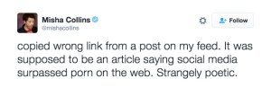 @mishacollins: copied wrong link from a post on my feed. It was supposed to be an article saying social media surpassed porn on the web. Strangely poetic. fandomjunkie2004 August 16, 2018December 4, 2018 Published by fandomjunkie2004 View all posts by fandomjunkie2004 Published August 16, 2018December 4, 2018