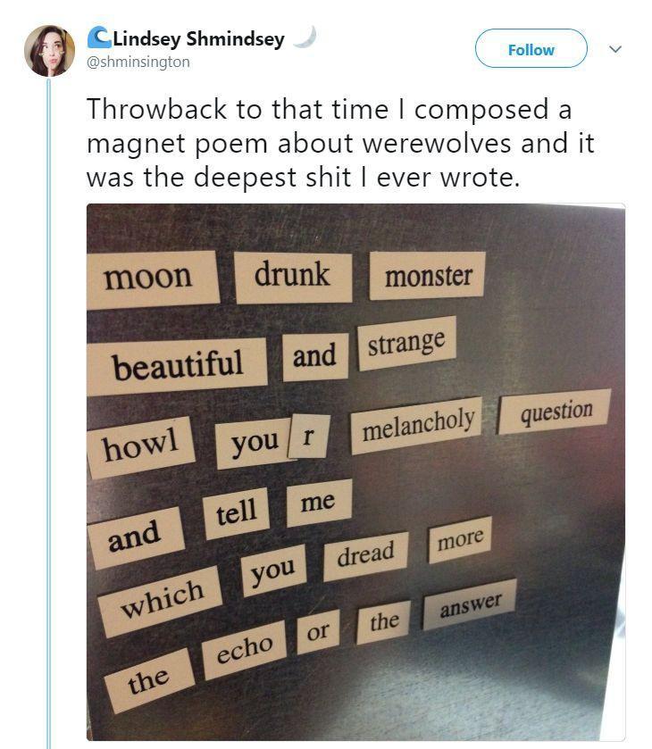 fandomjunkie2004 Uncategorized September 24, 2018December 4, 2018 1 Minute whitepeopletwitter: This world needs more werewolf poetry Share this: Share on X (Opens in new window) X Share on Facebook (Opens in new window) Facebook Like Loading... Related Published by fandomjunkie2004 View all posts by fandomjunkie2004 Published September 24, 2018December 4, 2018